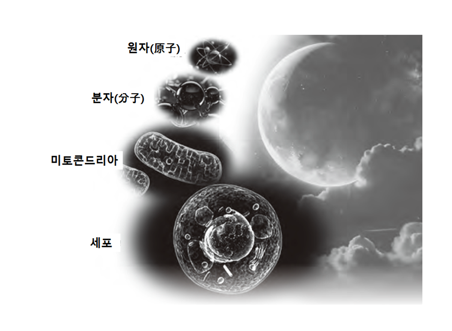 이번에는 반대로, 줌인하여 ‘작은 방향’으로 이동해 봅시다. 먼저 원래 크기로 돌아온 뒤, 이번에는 자신의 손 안으로 뛰어듭니다. 그 안에는 피부가 있고, 그 다음으로 세포, 미토콘드리아를 지나 분자와 원자가 보이기 시작합니다. 그런데 원자 안에도 아직 더 작은 무언가가 있는 것 같아, 조금 더 작은 방향으로 이동할 수도 있을 것 같습니다.